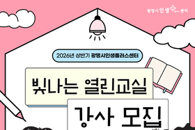 광명시(시장 박승원)는 오는 30일까지 ‘2026년 상반기 빛나는 열린교실’에 참여할 신중년 아마추어 강사를 모집한다. 모집 대상은 강의 경력 3년 이하의 시민이다. ‘빛나는 열린교실’은 신중년 세대의 풍부한 경험과 전문성을 지역사회와 공유하고, 새로운 사회참여 기회를 제공하기 위해 마련한 시민 주도형 열린 강좌다. 지원 자격은 관련 분야 자격증을 가진 50~64세(1960~1975년생) 광명시민이며, 40~49세(1976~1985년생)는 후순위 신청이 가능하다. 강의 분야는 디지털, 건강, 예술, 금융 등 시민이 직접 제안하는 독창적이고 흥미로운 콘텐츠라면 제한이 없다. 다만, 센터 정규강좌와 중복·유사한 내용은 제외되며, 기존 선발 강사가 재지원할 경우 동일한 내용의 강좌는 개설할 수 없다. 서류심사와 면접을 통해 선발된 강사는 2026년 1월 26일부터 2월 27일까지 자신의 전문 분야를 바탕으로 제안한 강좌를 광명시인생플러스센터에서 총 4회 진행하게 된다. 강의료는 시간당 4만 원 수준이다. 강의 운영에 필요한 수강생 모집, 홍보 등 행정적 지원뿐 아니라 강사 역량 강화 교육, 오리엔테이션, 센터 공식 블로그를 통한 강사 프로필 제작 및 홍보도 함께