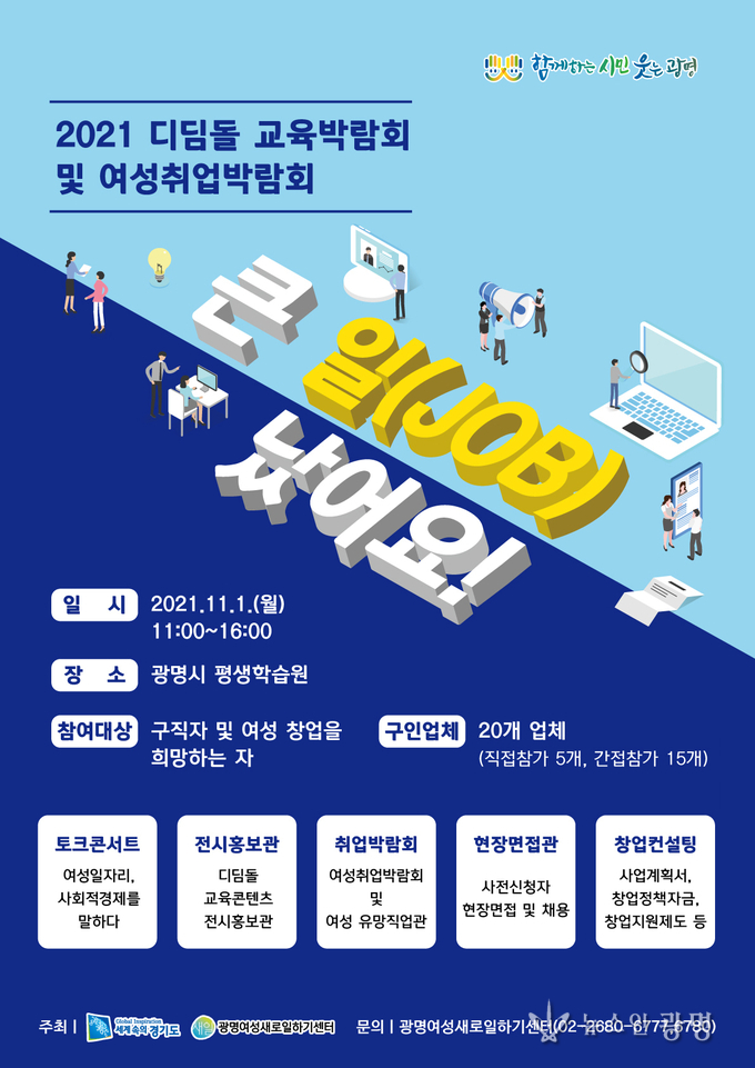 광명시(시장 박승원) 여성새로일하기센터는 11월 1일 오전 11시부터 오후 4시까지 광명시평생학습원에서 ‘2021 디딤돌교육박람회&여성교육박람회’를 개최한다.