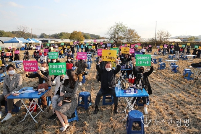 광명시(시장 박승원)가 그린뉴딜 프로젝트로 운영 중인 넷제로에너지카페 대표들과 1.5℃기후의병들이 지난달 30일 광명시 노온사동의 들판에서 진행된 논두렁콘서트에 참여해 기후위기 대응 캠페인을 벌였다.