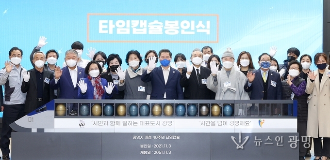 40년 동안 소장품을 보관할 타임캡슐은 KTX광명역이 남북평화철도출발역이 되기를 바라며 길이 4m, 높이 1m의 KTX 고속열차 모형으로 만들었다. 참석자들은 소장품이 담긴 용기를 타임캡슐에 넣었으며 광명시는 40주년 기념 홍보 영상, 사진, 시정안내책자, 코로나19백서, 광명·시흥 신도시 계획 관련자료 등을 넣었다.