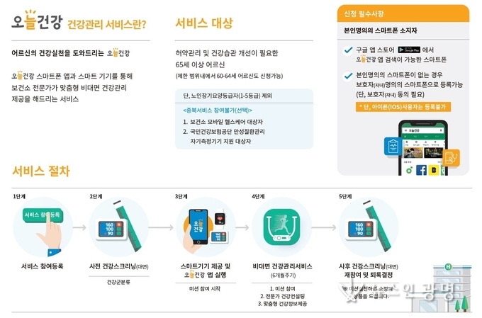 시는 기존 방문건강관리 대상자 중 건강관리행태 개선이 필요한 65세 이상 어르신 300명에게 스마트 기기(활동량계, 체중계, 혈압계, 혈당계 및 AI 생활스피커)를 제공하여 정보통신기술 활용 맞춤형 건강관리서비스를 비대면 방식으로 진행한다.
