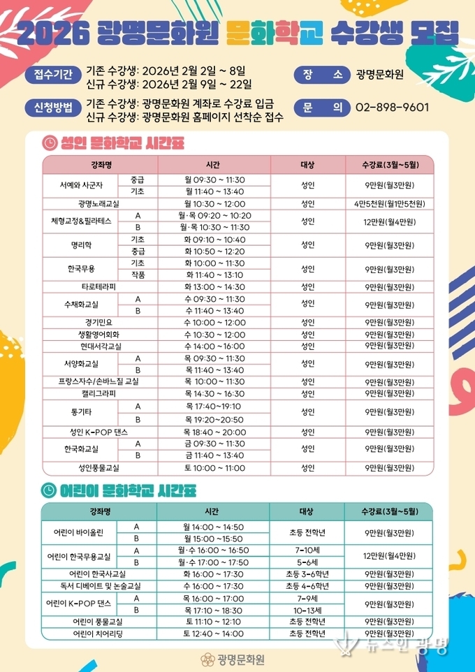문화학교 프로그램은 △서예와 사군자 △광명노래교실 △체형교정&필라테스 △명리학 △한국무용 △타로테라피 △수채화교실 △경기민요 △생활영어회화 △현대서각교실 △서양화교실 △프랑스자수/손바느질교실 △캘리그라피 △통기타 △성인K-POP댄스 △한국화교실 △성인풍물교실 등 17개의 성인 강좌와 △어린이바이올린 △어린이한국무용 △어린이한국사 △독서디베이트 및 논술 △어린이K-POP댄스 △어린이풍물교실 △어린이치어리딩 등 7개의 어린이 강좌이다. 한 강좌당 정원은 15~20명이며 오는 2월 9일부터 2월 22일까지 광명문화원 홈페이지를 통해 접수 가능하다.