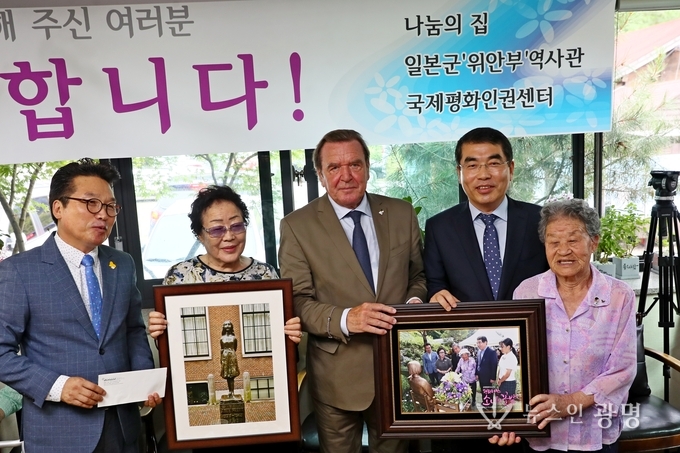 이에 슈뢰더 전 총리는 “할머니들이 복수와 증오심에서가 아니라 일본의 역사적으로 저질렀던 일을 인정하고 사과하기를 원한다고 들었다”며 “할머니들이 살아 생전에 일본이 사과하기를 바란다”고 답했다. 안신권 나눔의 집 소장은 슈뢰더 총리에게 고(故) 김순덕 할머니가 그린 그림 ‘끌러감’, ‘못다 핀 꽃’ 등을 전달했다.