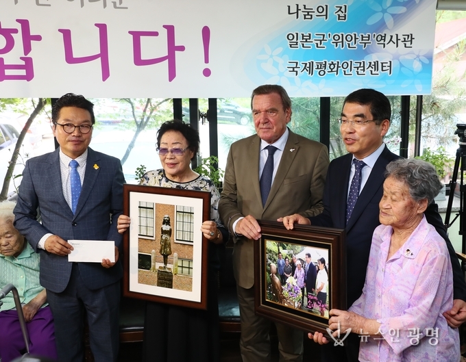 슈뢰더 전 총리는 양기대 광명시장, 주진오 상명대 교수와 함께 나눔의 집 위안부 역사관을 방문하고, 고인이 된 할머니들의 추모비와 흉상에 헌화와 묵념을 했다. 이어 이용수(90), 이옥선(91), 박옥선(94), 하점연(96) 할머니 등을 만나 안네 프랑크(1929~1945)의 얼굴 사진과 네덜란드 기념관 앞 동상 사진 및 기부금 1천만 원을 전달하며 깊은 위로의 뜻을 전했다. 양기대 광명시장은 할머니들에게 광명동굴 평화의 소녀상 둘레에 청소년들이 조성한 ‘소녀의 꽃밭’ 사진 액자를 전달했다.