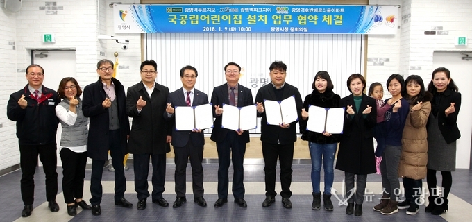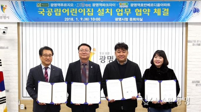 광명시(시장 양기대)는 9일 오전 10시 시청 중회의실에서 광명역세권(KTX) 광명역푸르지오, 광명역파크자이, 광명역호반베르디움아파트 단지 내 국공립어린이집을 설치·운영을 위한 협약을 체결했다.