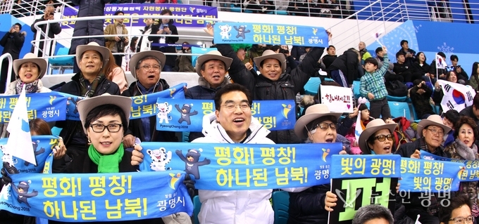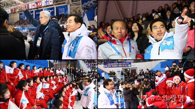양기대 광명시장과 광명시 응원단 50여명은 이날 강릉 관동하키센터에서 열린 여자 아이스하키 남북 단일팀 코리아와 스웨덴 간 경기에서 불과 10m를 사이에 두고 있는 북측 응원단과 함께 한반도기를 힘차게 흔들며 남북단일팀에 대한 응원을 펼쳤다.
