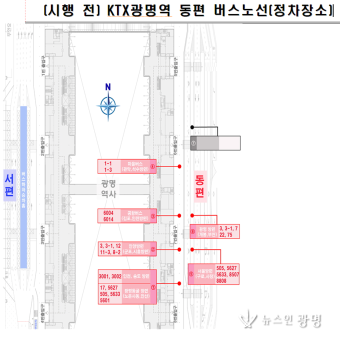 버스홈 및 버스정보시스템 총41개소 구축공사를 작년 11월에 착공하여 2월에 준공을 마쳐 KTX광명역의 환승체계를 개선하였다. 이와 더불어 서편 하차, 동편 승차의 우회 운행하는 일방향 버스노선을 양방향으로 분리하는 노선 개편도 단행하였다. 개편된 버스노선은 2월 21일 첫차부터 운행 개시될 예정이다.