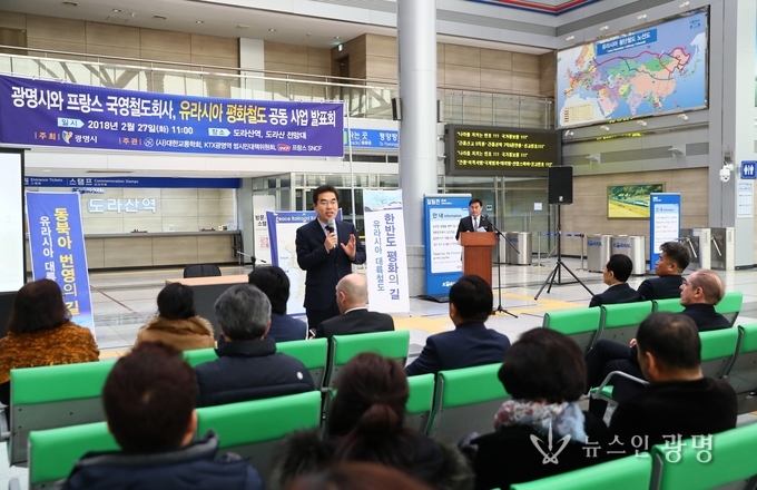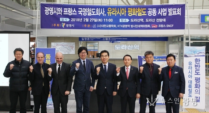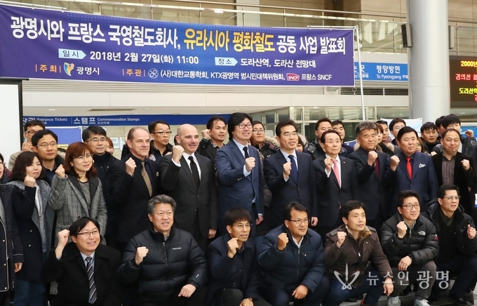 광명시(시장 양기대)는 27일 경의선 최북단역인 파주 도라산역에서 광명∼개성 간 유라시아 평화철도 노선개발 용역 최종보고회와 함께 KTX광명역사를 설계한 프랑스 국영철도회사(SNCF)와 역세권분석 공동사업에 착수했다고 밝혔다.