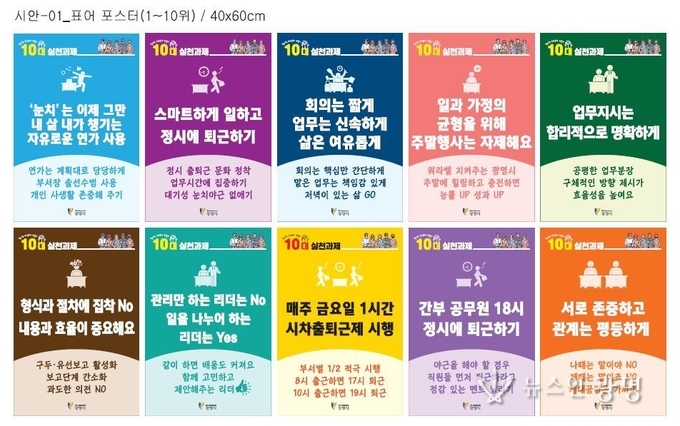 선정된 10대 실천과제는 △눈치는 이제그만 내 삶 내가 챙기는 자유로운 연가사용 △스마트하게 일하고 정시에 퇴근해요 △회의는 짧게 업무는 신속하게 삶은 여유롭게 △일과 가정의 균형을 위해 주말행사는 자제해요 △업무지시는 합리적으로 명확하게 △형식과 절차에 집착NO 내용과 효율이 중요해요 △관리만 하는 리더NO 일을 나누어 하는 리더YES △매주 금요일 1시간 시차출퇴근제 시행 △간부공무원 18시 정시에 퇴근하기 △서로 존중하고 관계는 평등하게 등이다.