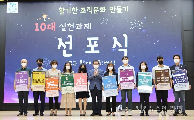 시청 대회의실에서 열린 선포식에는 박승원 광명시장, 이종구 광명시 부시장, 부서장, 직원 등이 참석했으며 10대 실천과제를 지키고 활기찬 직장 문화를 만들어 갈 것을 한마음으로 약속했다.