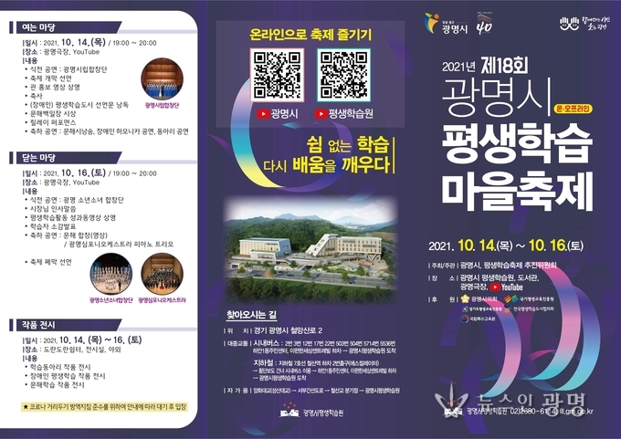 전국 최초 평생학습도시 광명시(시장 박승원)는 ‘쉼 없는 학습, 다시 배움을 깨우다’를 주제로 10월 14일부터 16일까지 광명시 평생학습원에서 제18회 광명시평생학습마을축제를 개최한다.