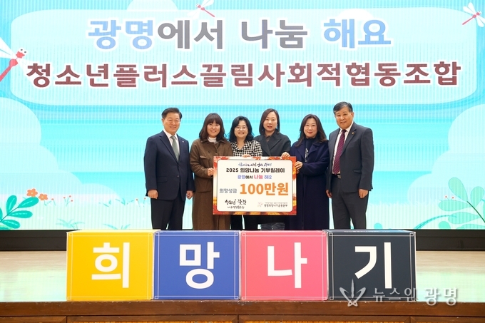 이날 전달식에는 광명시 박승원 시장, 청소년플러스끌림사회적협동조합 박원미 이사장, 이아리 이사, 최봉주 이사, 강은성 이사, 광명시사회복지협의회 이상재 회장 등이 참석했다.