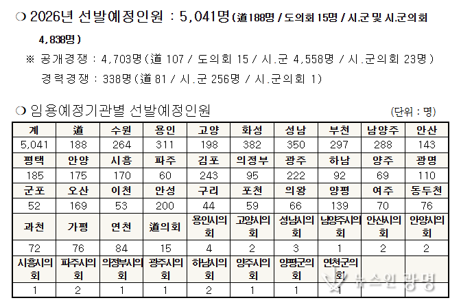 경기도가 2026년도 신규공무원 5,041명을 선발한다. 경기도와 31개 시군(의회 포함)을 모두 포함한 것으로, 지난해 채용인원인 2,897명에 비해 2,144명이 늘었다.