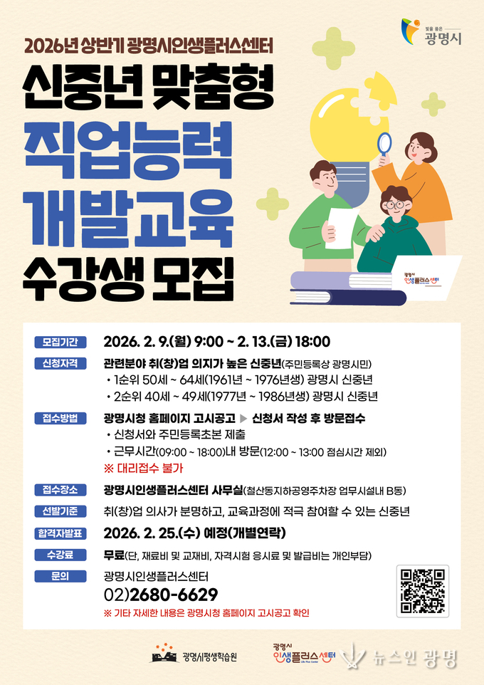 광명시(시장 박승원) 인생플러스센터는 신중년의 취업 경쟁력을 높이고 성공적인 인생 재도약을 지원하기 위해 오는 13일까지 ‘2026년 상반기 신중년 맞춤형 직업능력개발교육과정’ 수강생을 모집한다.