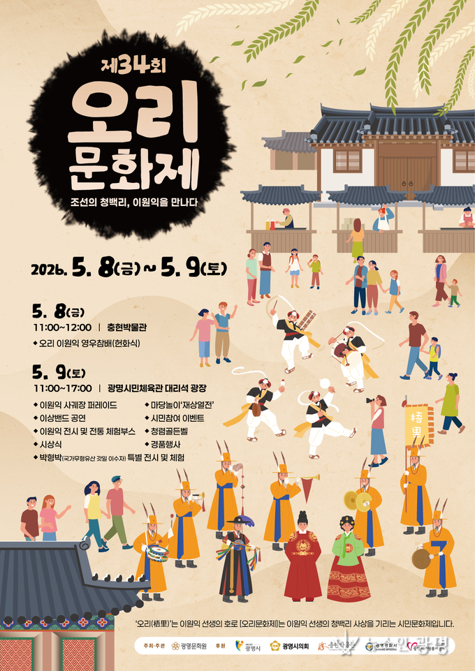 광명문화원(원장 윤영식)에서 주최·주관하는 광명시의 대표 시민문화축제인 오리문화제가‘조선의 청백리, 이원익을 만나다’라는 부제로 오는 5월 8일부터 9일까지 충현박물관과 광명시민체육관에서 열린다.