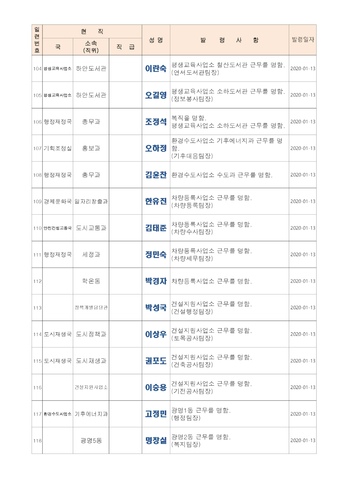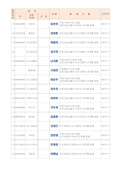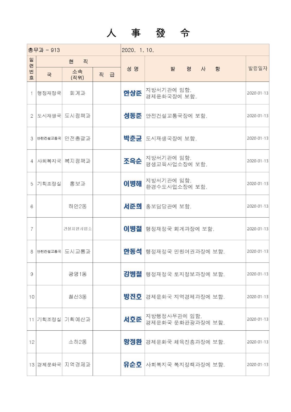 경제문화국장에 한상준, 홍보담당관에 서준희 등 1월 13일자 인사