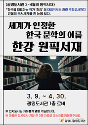 - ‘사람을 읽고, 책으로 잇는다’ 주제로 12월까지 인물 중심 도서 전시 코너 운영 - 3·4월 한강 작가 대표작 및 추천 도서 32권 집중 조명… 입체적 독서 기회 제공 광명시(시장 박승원) 광명도서관은 2026년 북큐레이션 주제를 ‘사람을 읽고, 책으로 잇는다’로 정하고, 인물 중심의 도서 전시 코너인 ‘원픽서재’를 운영한다. ‘원픽서재’는 작가와 출판·문화계 인사가 집필한 도서와 각종 매체에서 추천한 도서를 한곳에 모아 소개하는 전시다. 이번 전시는 특정 인물의 저서와 연관 도서를 함께 비치해 시민들이 작가의 문학적 세계관을 폭넓게 이해할 수 있도록 기획했다. 올해 첫 번째 주인공은 한국 문학의 위상을 높인 한강 작가다. 전시에서는 <채식주의자>, <소년이 온다> 등 대표작뿐만 아니라 작가가 평소 추천하거나 영감을 얻은 도서 등 총 32권을 선보인다. 전시는 광명도서관 1층 로비에서 진행하며 누구나 자유롭게 열람할 수 있다. 전시 도서의 대출을 원하는 경우 3층 자료실에서 관외 대출도 가능하다. 서준희 광명도서관장은 “한 인물의 문학 세계에는 세상을 바라보는 고유한 시선과 울림이 담겨 있다”며 “이번 전시로 인문학과 문학계의 흐름