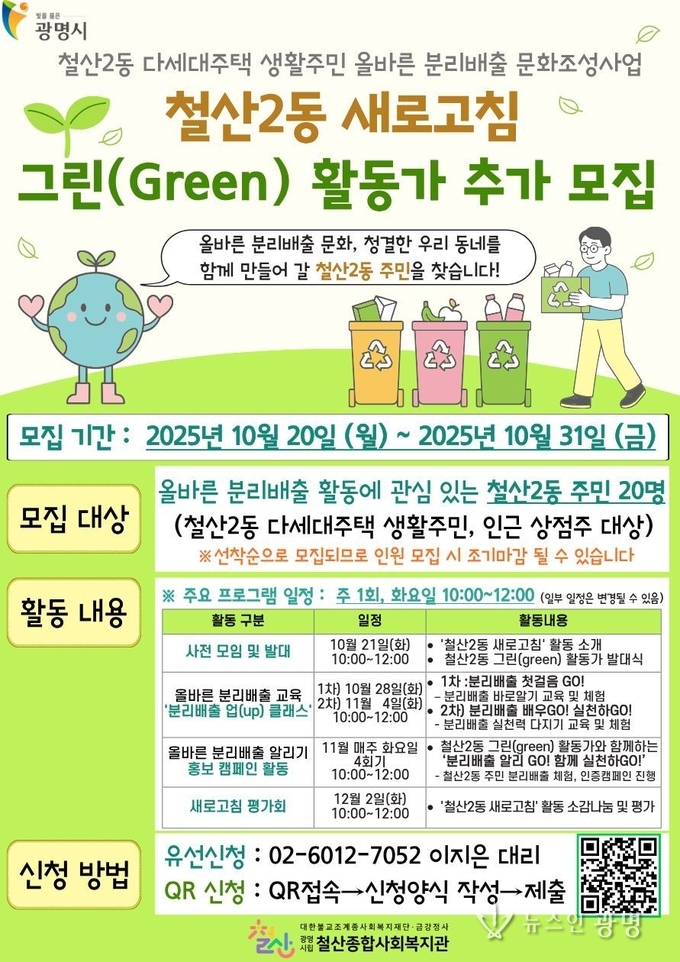 이 사업의 주축이 되는 ’그린(green)활동가‘는 철산2동 통장협의회와 분리배출, 환경 실천에 관심 있는 지역주민들로 구성되어 올바른 분리배출 문화 조성을 위한 활동을 통해 지역사회의 긍정적인 변화를 만들어가는 주민 활동가로 분리배출 문제 해결에 적극적으로 앞장서 활동할 계획이다.
