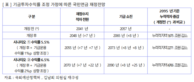 국회 보건복지위원회 소속 김남희 더불어민주당(광명을)의원이 입수한 국회 예산정책처의‘국민연금 기금 운용수익률 가정에 따른 재정 추계’에 따르면 국민연금 운용수익률을 연6.5%로 가정하면2090년에, 5.5%수익률에선2073년에 각각 기금이 고갈되는 것으로 나타났다.수익률을 연6.5%로 가정한 추정치가 나온 것은 처음이다.예정처는 정부 추계에서 적용되는‘장래인구추계’와‘거시경제전망’등 변수를 활용했다.