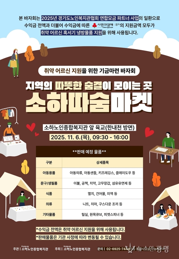 광명시립소하노인종합복지관(관장 서은경)은 오는 2025년 11월 6일(목) 오전 9시 30분부터 오후 4시까지, 복지관 앞 육교(한내천 방면) 일대에서 ‘따숨마켓’ 기금마련 바자회를 개최한다.