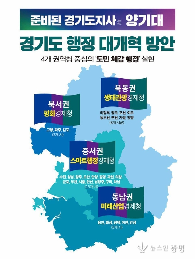 양기대 더불어민주당 경기도지사 예비후보가 경기도의 행정 체계를 4개 권역청 중심으로 재편하는 ‘경기도 행정 대개혁’ 구상을 강화했다.