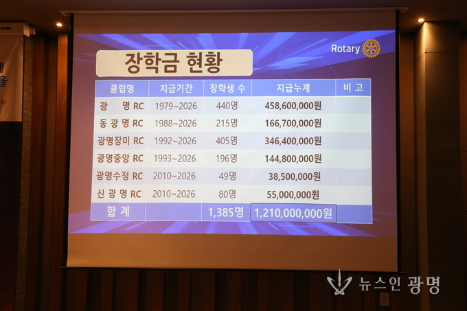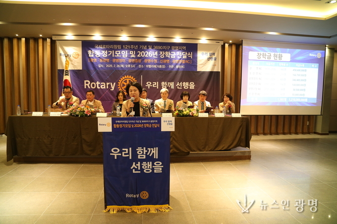 특히 이날 행사에서는 한국로타리장학문화재단 2026년 1학기 장학금 전달식이 진행되어 광명, 동광명, 광명장미, 광명중앙, 광명수정, 신광명 로타리클럽 등 각 클럽별 대표 장학생들에게 장학증서와 장학금이 수여됐다. 광명지역 총 장학금 규모는 12억 1천만 원에 달하며, 지역 인재 양성과 봉사정신 실천에 큰 의미를 더했다.