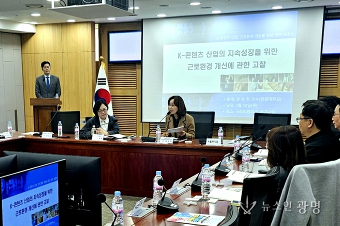 김재희 국민대학교 법학과 교수가 좌장을 맡고 권상집 한성대학교 사회과학부 교수가 발제를 맡아 K-콘텐츠 산업 근로환경의 현황과 구조적 문제, 제도 개선 방향을 제시했다.