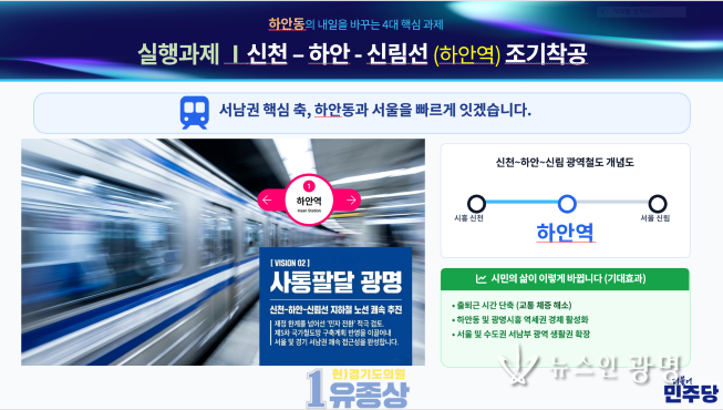 이번 공약의 핵심은 ▲신천~하안~신림선 조기 착공 ▲하안주공아파트 재건축 신속 추진 ▲광명·시흥 3기 신도시 보상 조속 이행 ▲광명형 통합돌봄 시스템 구축 등이다.