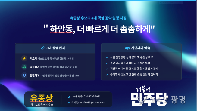 더불어민주당 소속 유종상 경기도의원 예비후보는 지난 11일 더불어민주당 광명(을) 정책발표회에서 하안동·학온동 발전을 위한 4대 핵심 공약을 발표하며 “더 빠르고 더 촘촘한 도시 변화”를 약속했다.