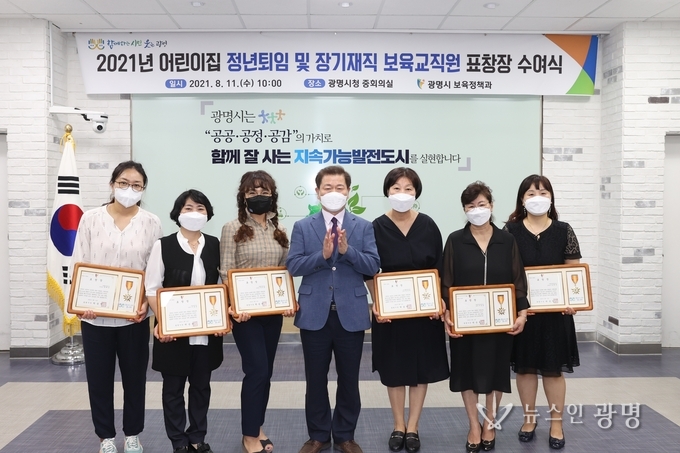 광명시(시장 박승원)는 11일 시청 중회의실에서 보육교직원과 간담회를 열어 보육현장에서 오랜 시간 어린이를 돌봐온 보육교직원을 표창하고 격려했다.