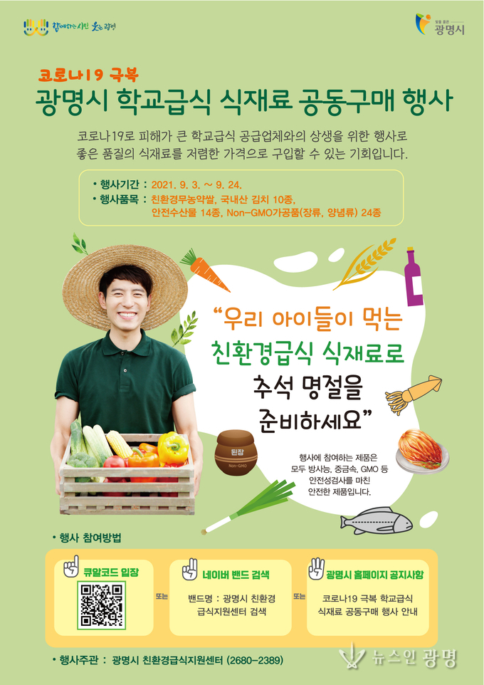 광명시(시장 박승원)는 9월 3일부터 9월 24일까지 ‘학교급식 식재료 공동구매 행사’를 연다.