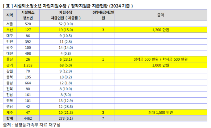 김남희 더불어민주당 ( 광명을 , 성평등가족위원회 ) 의원실이 성평등가족부로부터 받은 자료를 보면 , 지난해 시설을 퇴소한 가정밖청소년 4462 명 중 자립수당을 받은 인원은 273 명 (6.1%), 정착지원금을 받은 이들은 7 명 ( 부산 3 명 · 울산 1 명 · 제주 3 명 ) 에 불과했다 .