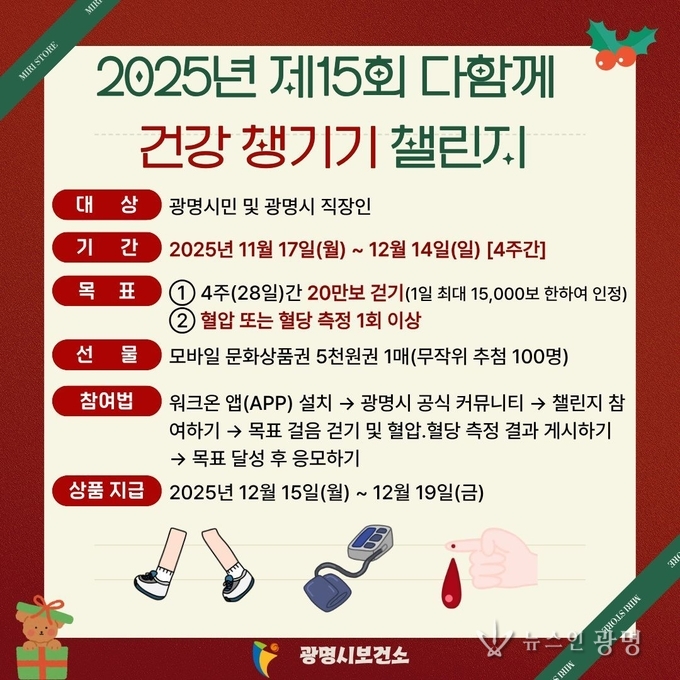 ‘제14회 다함께 광명해요 건강 걷기 챌린지’는 4주 동안 총 20만 보 걷기를 목표로 진행한다. 1일 최대 1만5천 보까지 인정하며, 참가자는 워크온 앱으로 걸음 수를 기록하고 목표를 달성하면 응모할 수 있다. 완주자 중 추첨을 통해 100명에게 모바일 문화상품권(5천 원권)을 증정한다.
