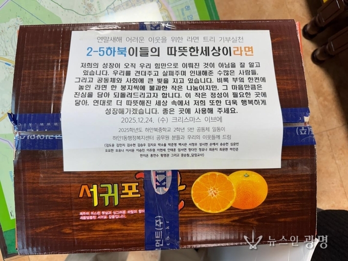 광명시 하안북중학교 2학년 5반 학생들은 지난 24일 연말을 맞아 지역 내 어려운 이웃을 돕기 위해 학생 11라면 기부활동으로 모은 라면 1박스를 하안1동 지역사회보장협의체에 전달했다.
