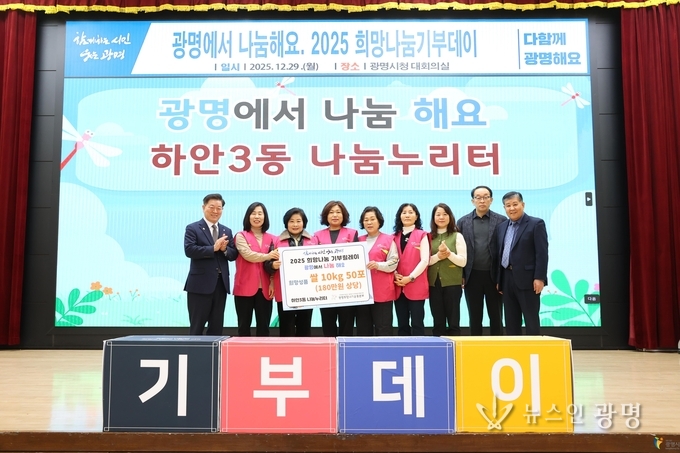 12월 29일(월), 하안3동나눔누리터(단장 이미경)에서 광명시사회복지협의회(회장 이상재) 광명희망나기운동사업(이하 광명희망나기운동본부)에 희망성품 쌀 10kg 50포(180만원 상당)를 전달했다.