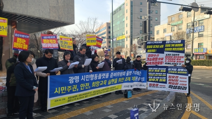 광명 지역 시민단체들이 참여하는 ‘광명 시민행동플랫폼 준비위원회’가 1월 19일 광명시청 앞에서 기자회견을 열고 시민주권 회복과 안전한 도시, 희망교육 실현을 목표로 한 조례 제정운동에 나섰다.