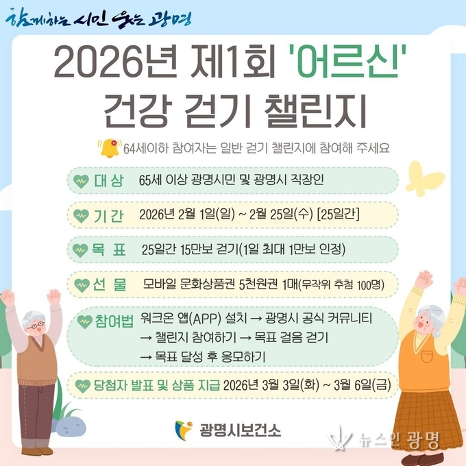 광명시(시장 박승원)가 오는 2월부터 모바일 걷기 플랫폼 ‘워크온(WalkOn)’을 활용한 걷기 챌린지 방식을 개편하고, 65세 이상 시민을 위한 ‘어르신 걷기 챌린지’를 별도로 운영한다고 21일 밝혔다.
