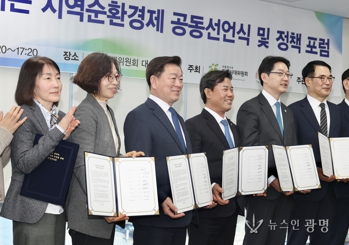 사례 발표에 앞서 김경수 지방시대위원장, 5개 지자체장(광명시, 부여군, 영암군, 대전 중구, 울산 동구) 등이 함께 지역을 살리는 지역순환경제 추진을 위한 공동선언문을 발표했다.