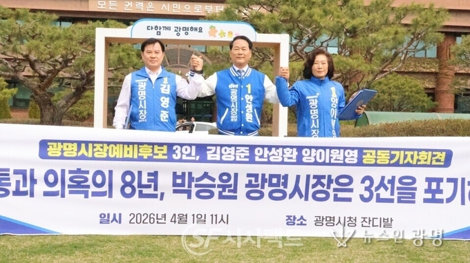 어제 오전, 김영준, 안성환, 양이원영 세 광명시장 예비후보는 ‘불통과 의혹의 8년, 박승원 광명시장은 3선을 포기하라,는 제목의 공동 기자회견을 진행했다.