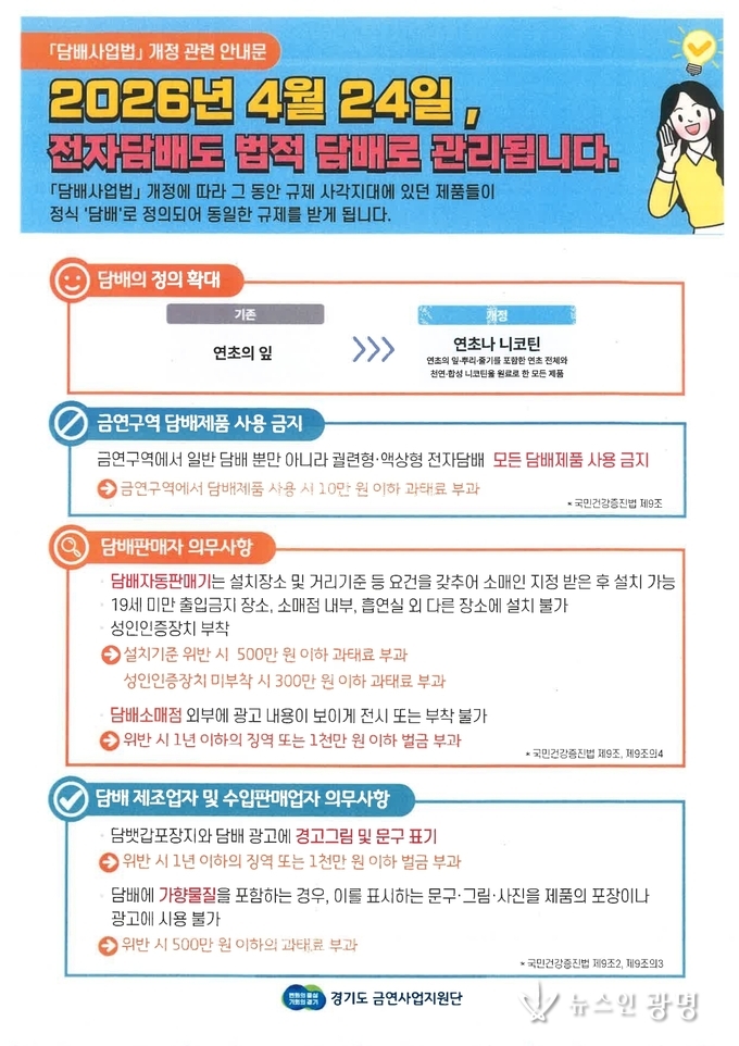 광명시 보건소는 시민 건강을 증진하고 간접흡연 피해를 막기 위해 오는 5월 15일까지 ‘2026년 담배 정의 확대에 따른 금연구역 합동 점검·단속’을 한다.