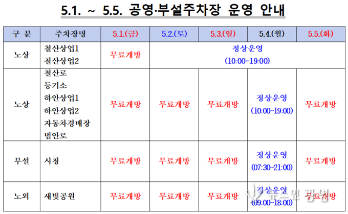 이번 무료 개방은 현장 주차관리원의 휴식 여건을 보장하고 재충전의 기회를 제공하는 한편, 징검다리 휴일 기간 주차 편의를 높여 지역 상권 활성화에도 기여할 것으로 기대된다.