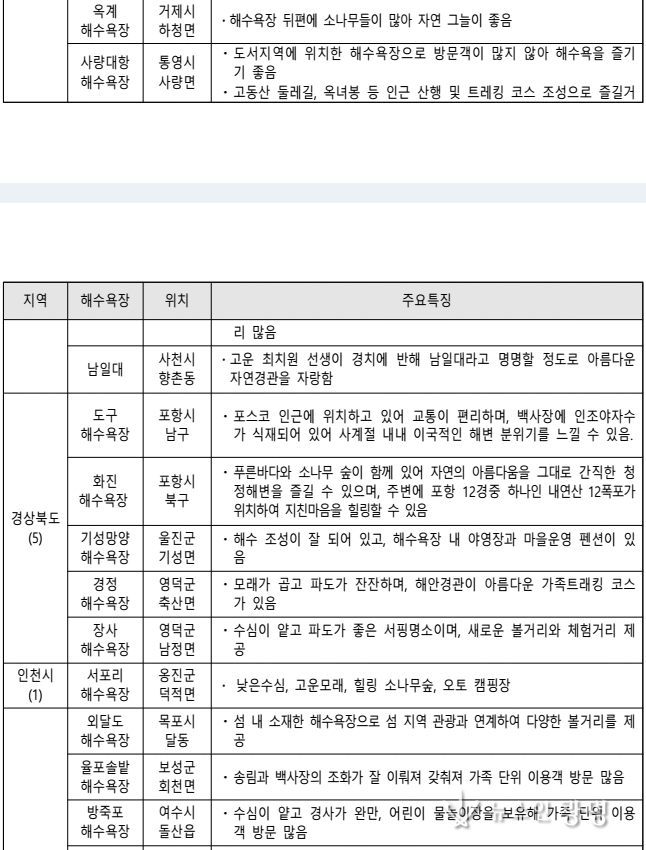 지역별 한적한 해수욕장은 강원지역 12곳, 경북지역 5곳, 경남지역 7곳, 전남지역 13곳, 전북지역 3곳, 충남지역 7곳, 인천과 제주가 각각 1곳씩 선정되었다.