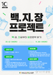 - 1월 12일부터 누리집 선착순 접수… SF·웹소설 등 장르문학 활성화 기대 - 100권 달성 시 ‘장르문학 마스터’ 인증서 수여 광명시(시장 박승원) 소하도서관은 오는 12일부터 장르문학 도서 100권 읽기 챌린지인 ‘백.지.장 프로젝트’ 참여자를 모집한다. ‘백 권, 지금부터 장르문학 읽기’의 줄임말인 이번 프로젝트는 시민들이 장르문학의 매력을 발견하고 독서를 생활화할 수 있도록 기획한 사업이다. 참여자는 1월부터 11월까지 소하도서관 3층 장르문학존에 비치된 도서를 읽고 서평을 작성해 인증하면 된다. 챌린지 목표는 30권, 50권, 70권, 100권 등 총 4단계로 구성했다. 신청자에게는 전용 독서노트가 제공되며 최종 단계인 100권을 달성한 참여자에게는 ‘장르문학 마스터’ 인증서를 수여한다. 소하도서관은 지난 2024년 4월부터 종합자료실Ⅱ 내에 공상과학(SF), 판타지, 웹소설, 웹툰 등을 별도로 비치한 ‘장르문학존’을 조성해 운영 중이다. 이번 프로젝트는 해당 특화 구역의 도서들을 활용해 운영될 예정이다. 참여 대상은 광명시도서관 정회원이라면 누구나 신청할 수 있다. 오는 12일부터 광명시도서관 누리집(gmlib.gm.go.kr)을 통해 선착순으