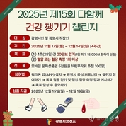 광명시(시장 박승원) 보건소는 시민의 건강한 생활습관 형성과 신체활동 증진을 위해 오는 17일부터 12월 14일까지 4주간 두 가지 건강 걷기 챌린지를 운영한다. 이번 챌린지는 광명시민과 관내 직장인 누구나 참여할 수 있으며, 모바일 앱 ‘워크온(WalkOn)’을 설치한 뒤 광명시 공식 커뮤니티에 가입하면 된다. 비대면으로 간편하게 참여할 수 있는 건강 증진 프로그램으로, 시민이 일상 속에서 꾸준히 건강관리 습관을 기를 수 있도록 돕는다. ‘제14회 다함께 광명해요 건강 걷기 챌린지’는 4주 동안 총 20만 보 걷기를 목표로 진행한다. 1일 최대 1만5천 보까지 인정하며, 참가자는 워크온 앱으로 걸음 수를 기록하고 목표를 달성하면 응모할 수 있다. 완주자 중 추첨을 통해 100명에게 모바일 문화상품권(5천 원권)을 증정한다. 또한 ‘제15회 다함께 건강 챙기기 챌린지’는 걷기와 함께 혈압 또는 혈당을 1회 이상 측정하도록 구성했다. 참가자는 20만 보 걷기 목표를 달성한 후 혈압 또는 혈당 측정 결과를 해당 챌린지 게시판에 게시하면 참여가 인정되며, 이 역시 추첨으로 100명에게 모바일 문화상품권(5천 원권)을 제공한다. 두 챌린지의 당첨자 발표와 상품 지급